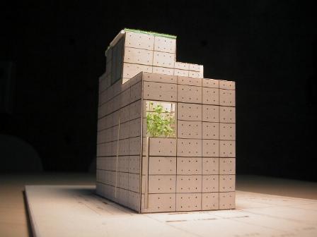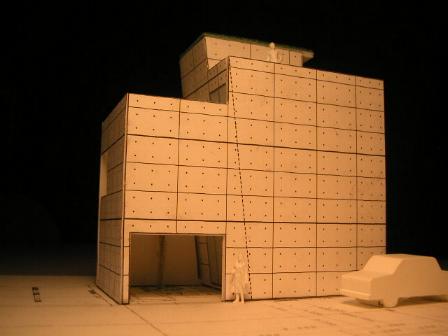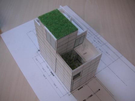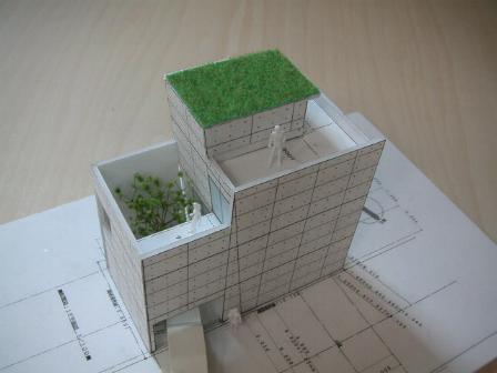 道路からは水平垂直の安定した形態を守るが、コートには機能上重要な斜めの壁を持つ。