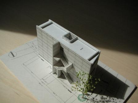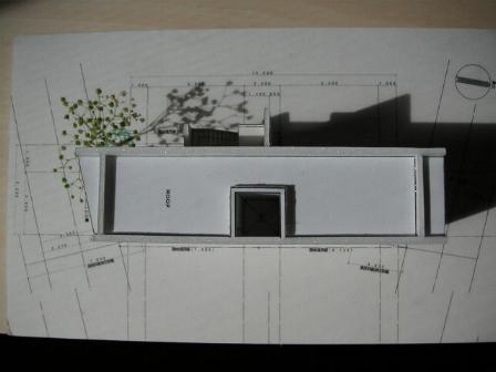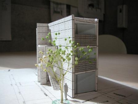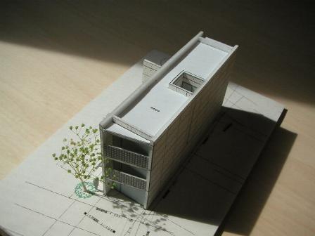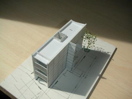 間口が狭く南北に奥行の長い敷地に、幾何学の長方形の単純なプランを考えた。スケルトンの店舗・コートを持つ集合住宅の形態である。