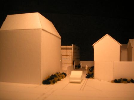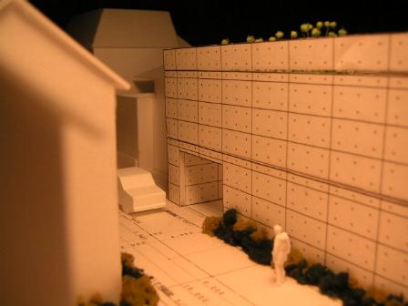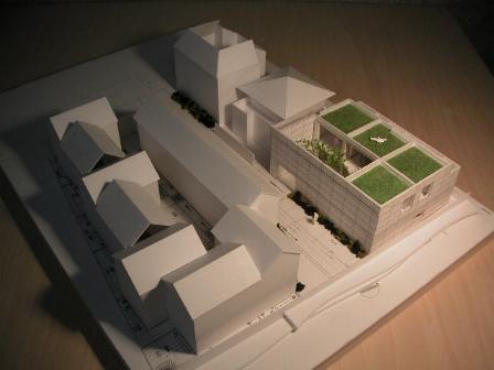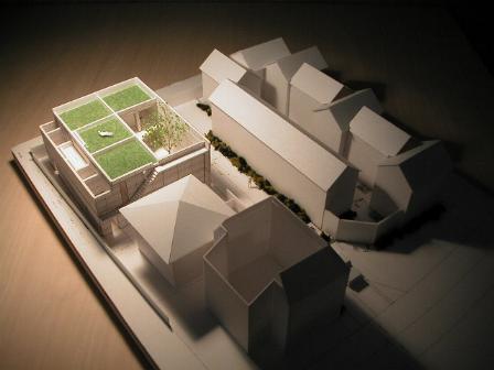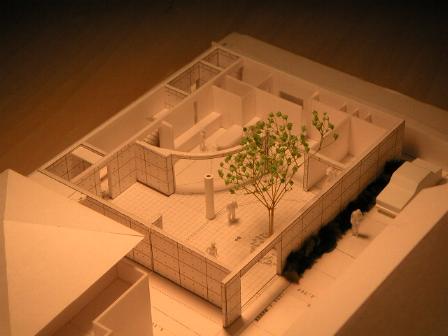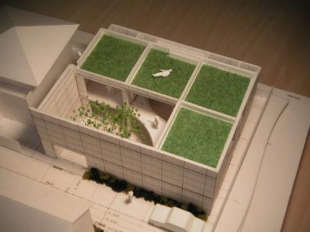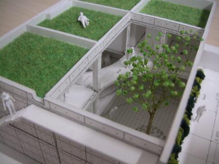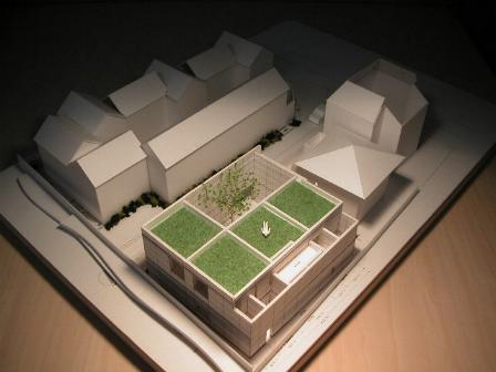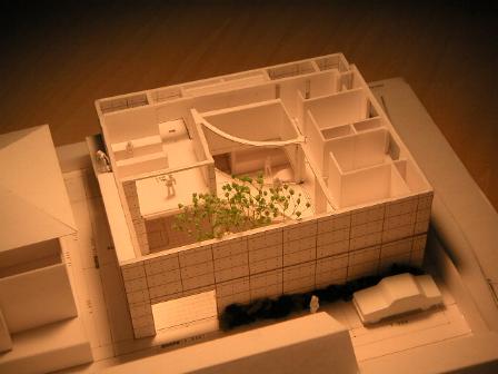 5m×10mの大きなコートを中心に建物は配置される。2世帯住宅のため、将来を考えたフレキシブルな空間形態を考慮した。
