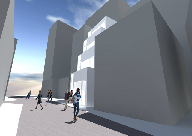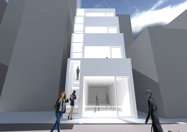 鉄筋コンプラストコンクリート造4階建て…商業地域ながら道路斜線が厳しいため階段状の形状を考えた…