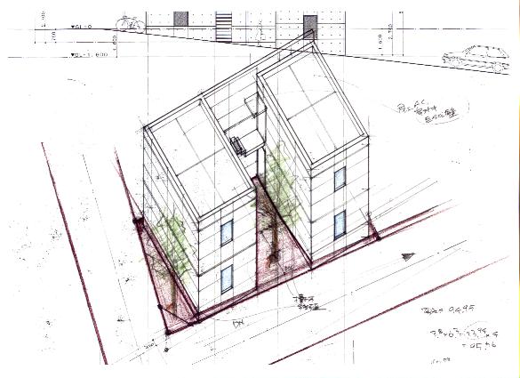 敷地に2m程度の高低差があるため、その高低差を利用して建物を2棟に分け、中央にコート・樹木を配置した。