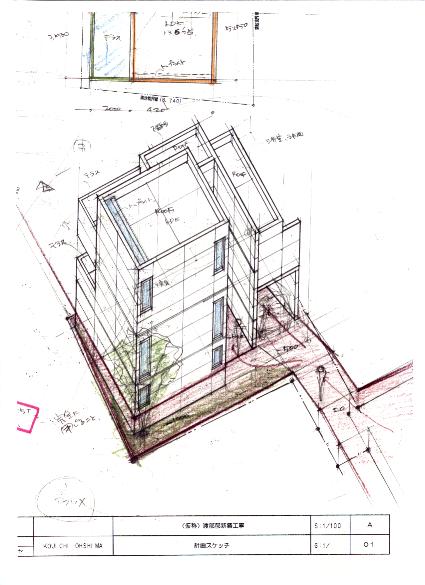 24坪程度の敷地に1階を半階埋めた、地下1階地上2階の専用住宅。